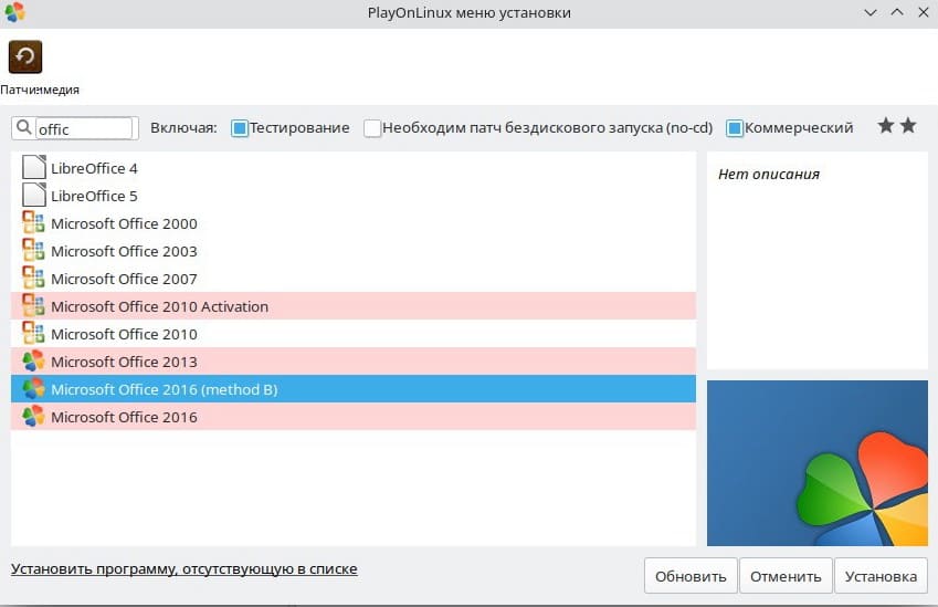 4. В строке поиска найдите подходящую версию Microsoft Office. PlayOnLinux поддерживает версии 2010 и 2016, но более новый Office 2021 установить не удастся. Рекомендуется выбирать 32-битные версии, так как они работают более стабильно.