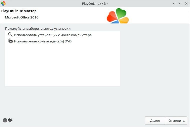 Если у вас есть DVD, вставьте его в компьютер. Если нет, можно подключить ISO-файл и указать его в PlayOnLinux как нужный диск. Другой вариант — распаковать ISO-файл в папку, выбрать опцию «Использовать установщик с моего компьютера» и указать setup.exe
