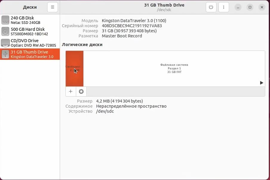 – Утилитой «Диски» (встроена в некоторые дистрибутивы linux).