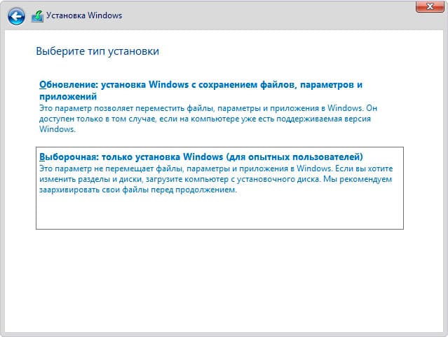 2. Начнется стандартная установка Windows, где необходимо выбрать вариант «Выборочная (только установка Windows)».