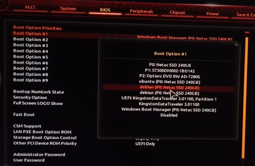 2. Установите загрузку с Linux (например, Debian) в качестве приоритетного варианта.