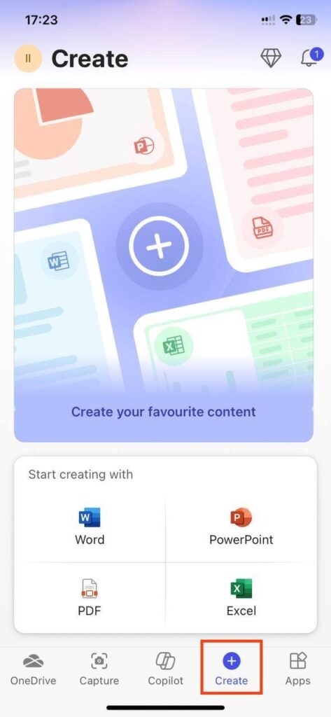 3. Once you sign in, the license will automatically activate your application and you will be able to use all the features of Microsoft Office! You can open existing documents from the OneDrive cloud or your phone’s memory, or create new documents. Click on the “Create” button and you will be presented with a selection of applications such as Word, Excel, PowerPoint, etc. to choose from.