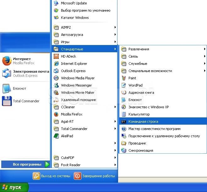 Заходим в меню Пуск – Все программы – Стандартные. Выбираем “Командная строка”.