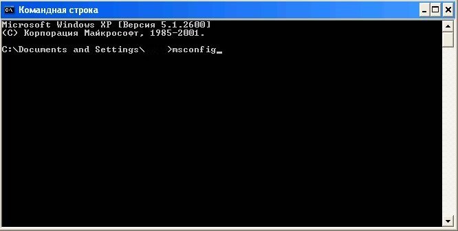 Появится черное окно командной строки, в котором вводим msconfig и нажимаем Enter.