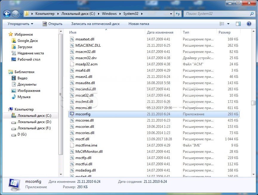 Заходим в проводник по адресу C:\Windows\System32 и находим файл msconfig.exe.