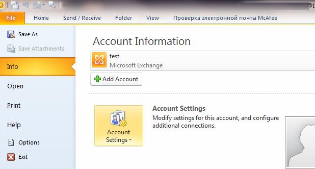 1. Откройте Outlook 2010 и перейдите к настройке учетной записи почты: File -> Info -> Account Settings.
