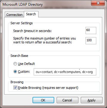 5. На вкладке Search в поле Custom укажите DN имя ранее созданного организационного юнита Active Directory, где хранится список контактов (например, ou=Contact,dc=softcomputers,dc=org), и включите опцию Enable Browsing.
