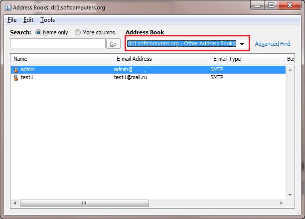 2. В качестве источника контактов выберите адресную книгу с именем вашего контроллера домена (например, dc1.softcomputers.org).