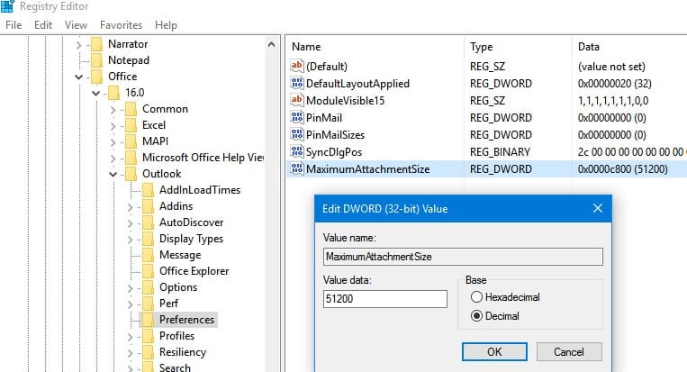 REG ADD HKEY_CURRENT_USER\Software\Microsoft\Office\16.0\Outlook\Profiles\Outlook\Preferences\ /v "MaximumAttachmentSize" /t REG_DWORD /d 51200 /f