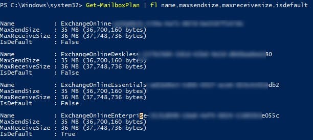 Get-MailboxPlan | fl name,maxsendsize,maxreceivesize,isdefault
