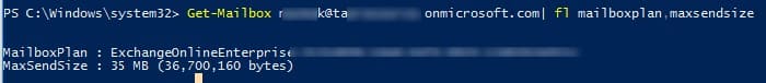 Get-Mailbox kbuldogov@winitpro.onmicrosoft.com | fl mailboxplan,maxsendsize