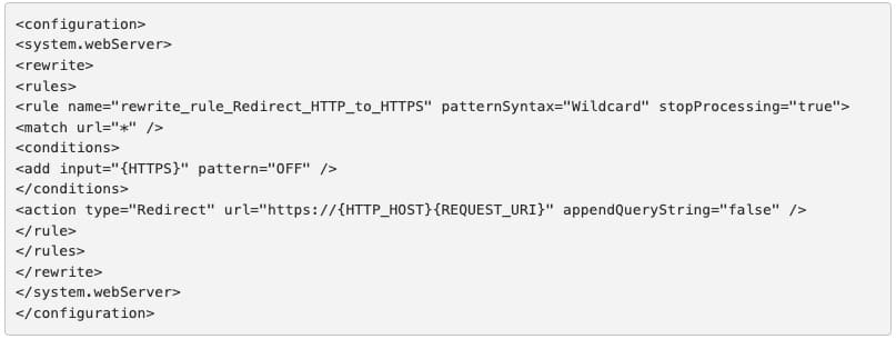 Вы также можете вручную настроить редирект HTTP на HTTPS с помощью файла web.config. Для этого добавьте следующие строки в раздел rewrite: