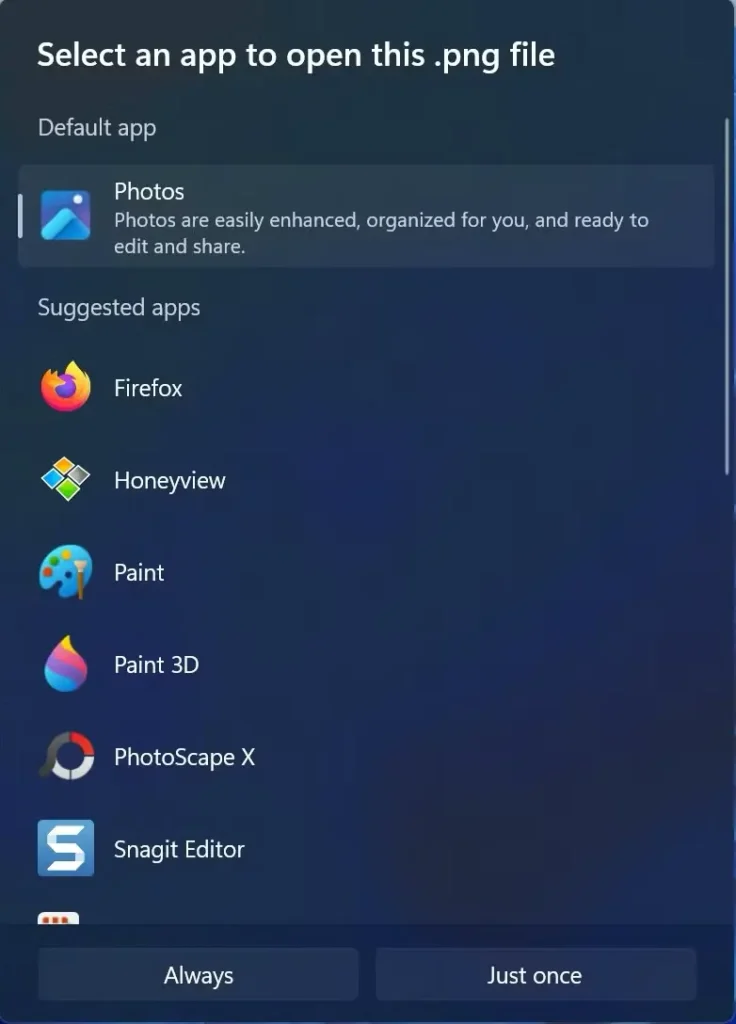 Then click – Always if you want this file type to always open with the selected application.