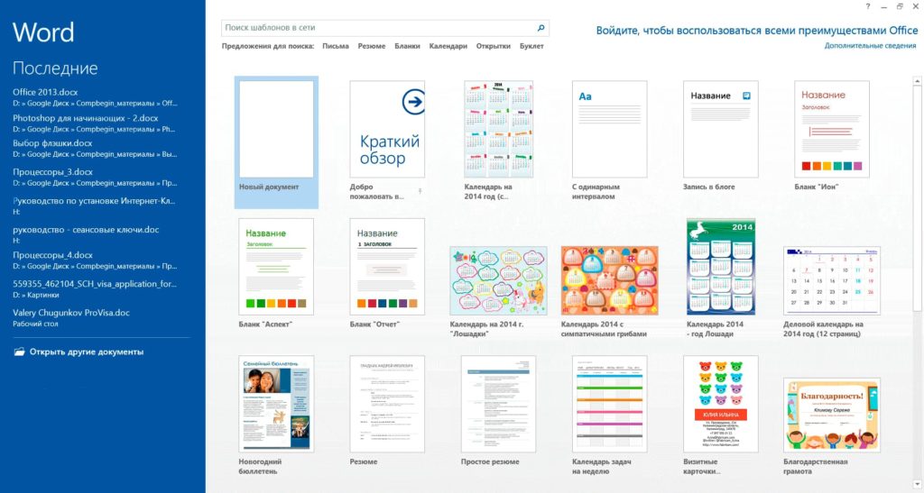 2) Стартовая страница Microsoft Office 2013. Теперь при открытии Office 2013 пользователь видит не пустой (новый) документ, как это было сделано в Office 2010, а на стартовую страницу Microsoft Office. Где отображается список недавно открытых документов, а так же основная площадь стартовой страницы отведена на множество шаблонов с которыми Вы можете тут же начать работать.