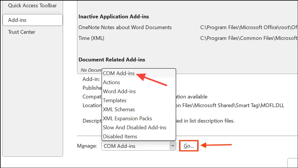 2. At the bottom of the window select Manage: COM Add-ins and click Go.