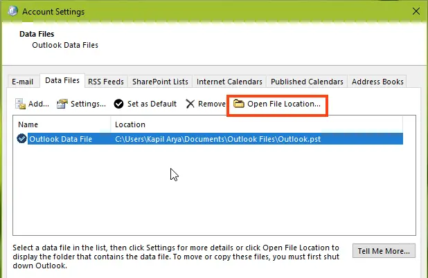 2. Click Open File Location and check the PST/OST file sizes on disk.