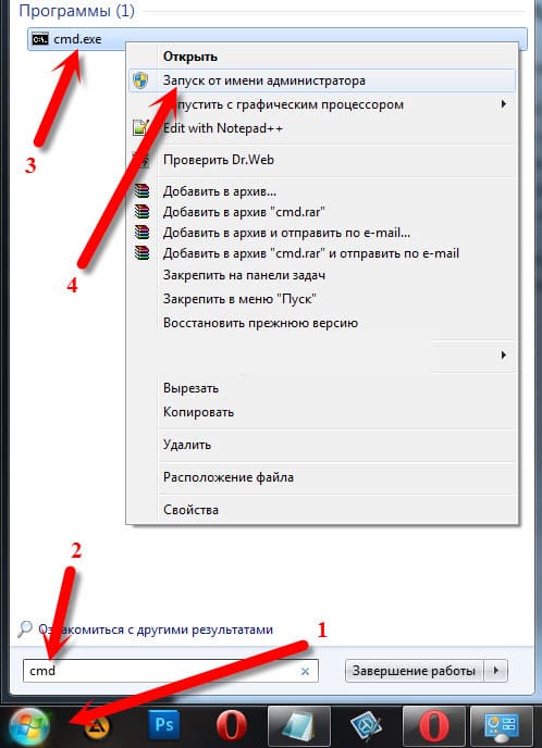 1. Запустите командную строку от имени администратора. Для этого нажмите на кнопку “Пуск“, в строке поиска введите cmd, затем нажмите правой кнопкой мыши на “cmd.exe” и выберите “Запуск от имени администратора”.
