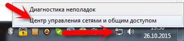 1. Нажмите правой кнопкой мыши на значок подключения к интернету и выберите “Центр управления сетями и общим доступом“.