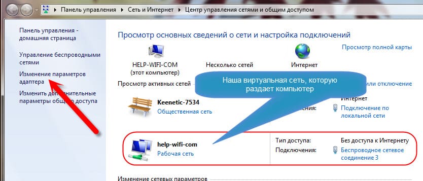 2. В левом меню выберите “Изменение параметров адаптера“. Здесь вы увидите запущенную виртуальную сеть, которая пока что имеет статус “Без доступа к интернету”.