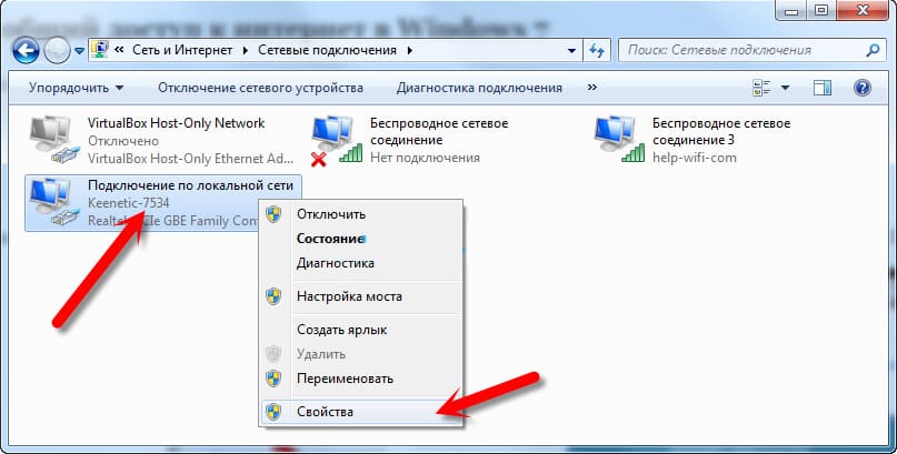 3. Найдите подключение, через которое ваш ноутбук подключён к интернету (например, “Подключение по локальной сети”), щёлкните по нему правой кнопкой мыши и выберите Свойства.