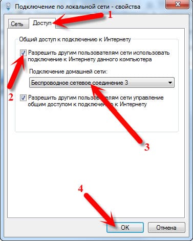 4. Перейдите на вкладку “Доступ” и установите флажок “Разрешить другим пользователям сети использовать подключение к Интернету данного компьютера“. В выпадающем списке выберите созданную беспроводную сеть и нажмите “ОК”.