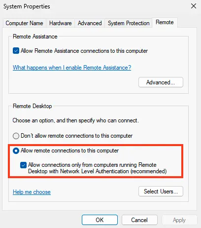 In Windows 7, this option is worded differently: Allow connections from computers running any version of Remote Desktop (less secure).