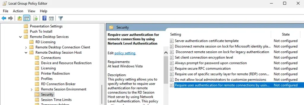 – Navigate to Computer Configuration > Administrative Templates > Windows Components > Remote Desktop Services > Remote Desktop Session Host > Security.