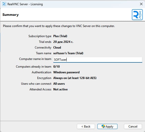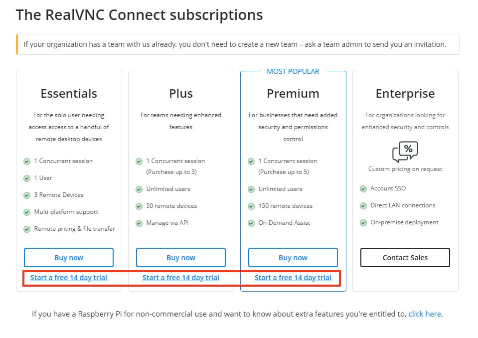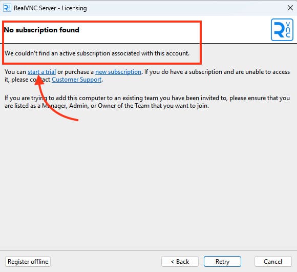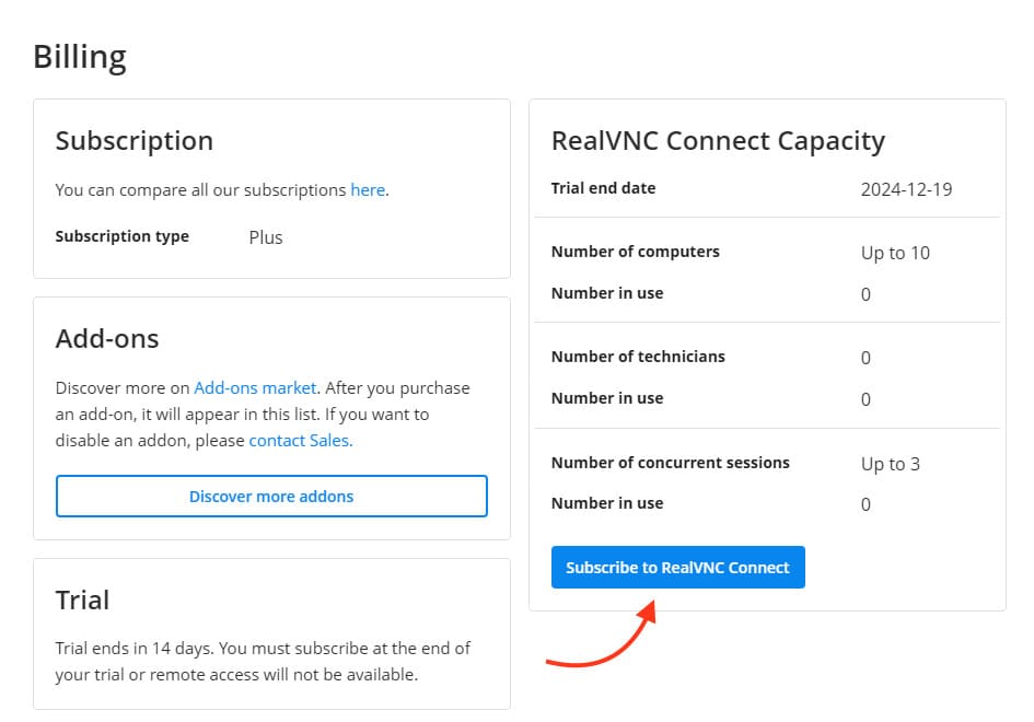3) Нажмите Start a free 14-day trial, а затем подтвердите, нажав Subscribe to RealVNC Connect.