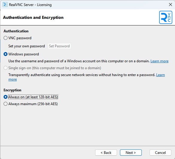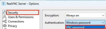 2) В разделе Security измените параметр Authentication на VNC Password.