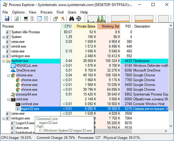 3. Наведите указатель мыши на процесс regsvr32.exe, и вы увидите строку Command line с командой и именем библиотеки DLL, с которой ведётся работа (у меня на скриншоте такой команды нет). Это поможет определить, какая программа или компонент вызвали перегрузку.