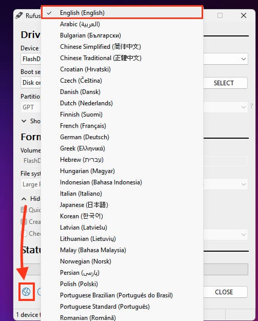 – Click on the Planet icon and choose your language, in our case, it’s English.