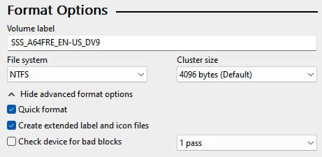 You can set the disk label and select quick format. Leave the default settings unless other requirements apply.