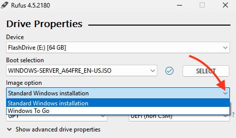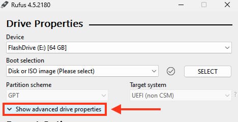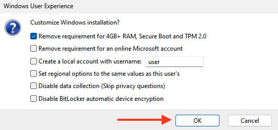 Click “START”, and if you are using a Windows 11 image, Rufus will offer: