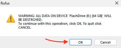 A final pop-up will appear before the distribution begins writing to the flash drive, click “OK”.