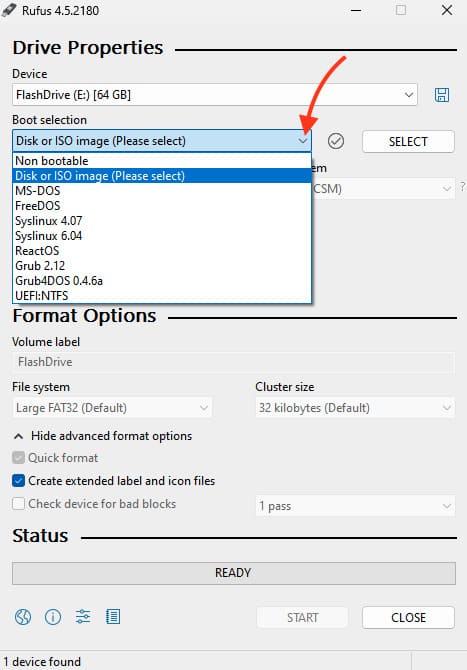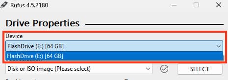 Next, select the USB device for creating the bootable flash drive in the “Device” section.