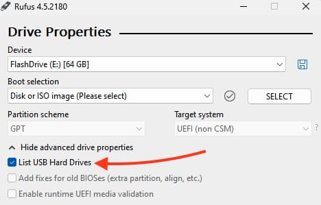 If the drive is displayed as a local disk, it may not appear in the list. To fix this: