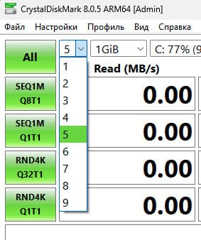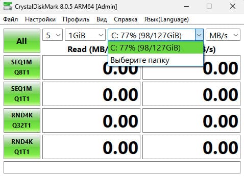 Выбор диска: В верхней части окна выберите диск, который вы хотите протестировать (например, SSD, жесткий диск или флешку).