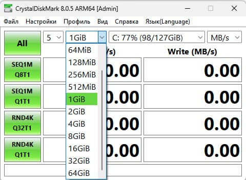 Настройки теста: Оставьте параметры по умолчанию — они подойдут для большинства пользователей. Можно выбрать размер тестового файла и количество тестов, но, если вы не уверены, просто оставьте настройки без изменений.