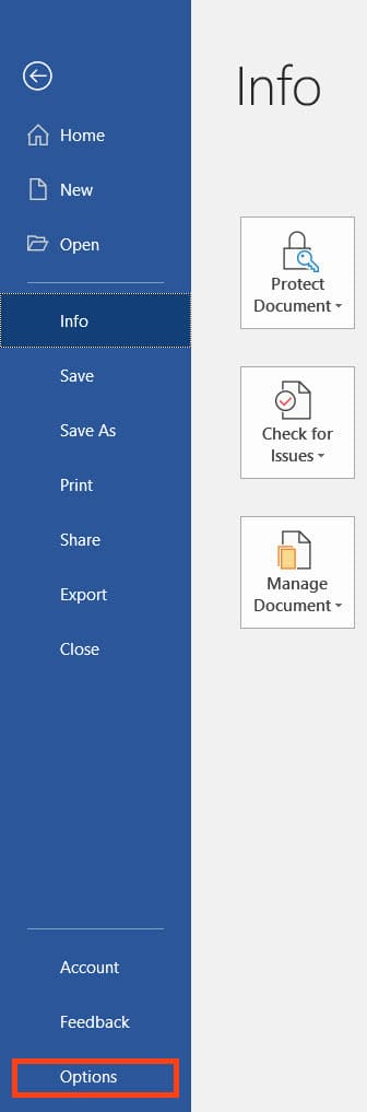 1) Open Word => go to the “File” menu => Options.