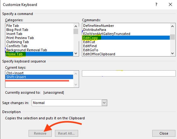 3) Click on the “Home” tab in the left column, and on the right, sequentially search for the tabs – EditCopy, EditCut, and EditPaste. When you find the desired tab, for example, “EditCopy,” at the bottom, select the unnecessary key combination starting with Shift and click “Remove.”