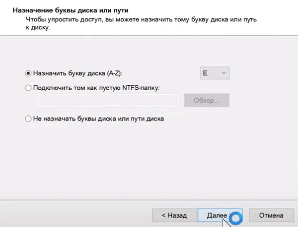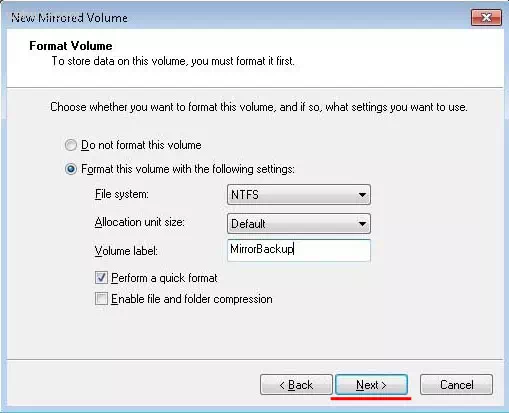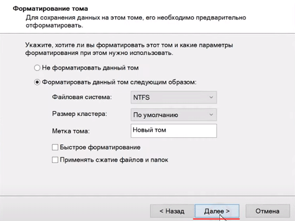 5) Укажите файловую систему (рекомендуется NTFS), задайте размер блока и имя тома. Нажмите Далее.
