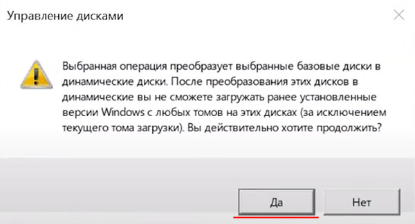 После завершения настройки Windows выдаст предупреждение о преобразовании базовых дисков в динамические и о невозможности загрузки с них ОС. Нажмите ОК.