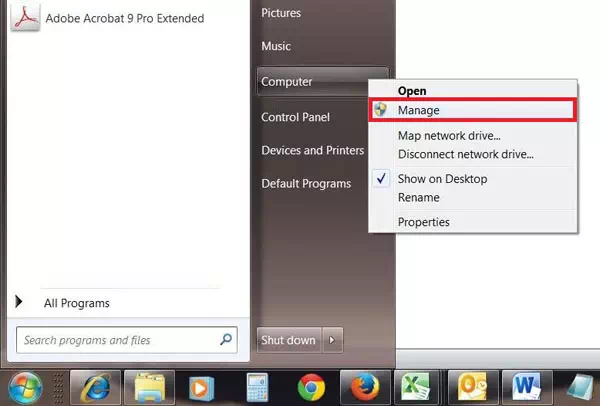 1) Откройте Пуск, щелкните правой кнопкой мыши по Компьютер и выберите Управление.