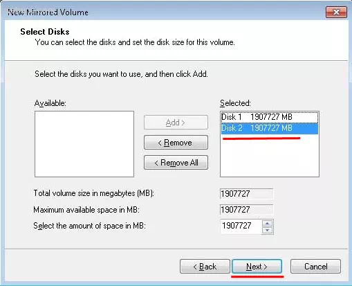3) В меню выберите диски, которые вы хотите объединить в RAID, и нажмите Далее.