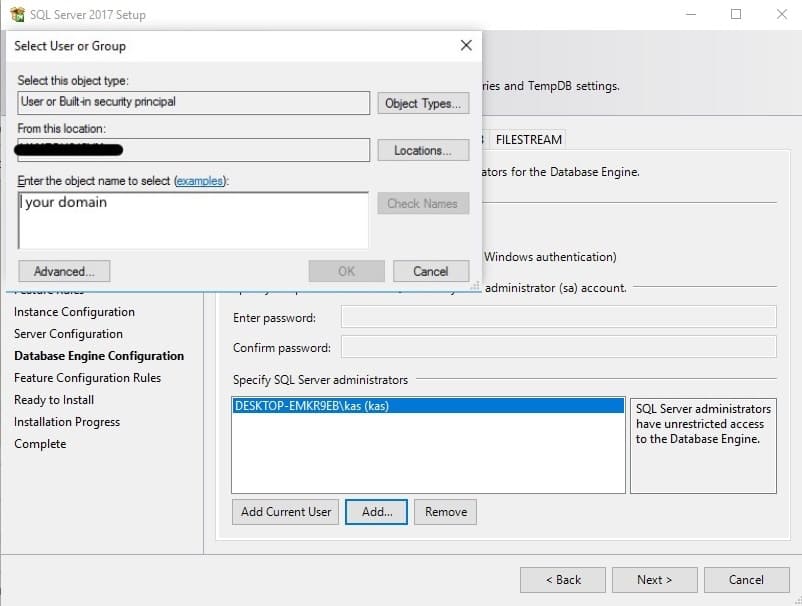 At this stage, it makes sense to click “Add Current User” to add the current user, and you can also add your domain account.
