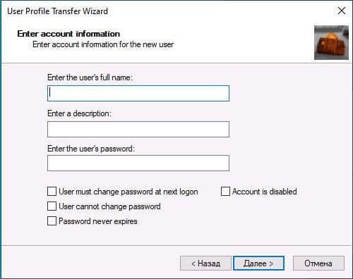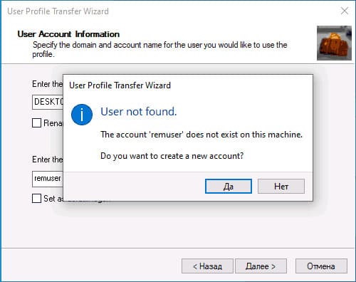 3. Введите имя пользователя (по умолчанию будет предложено то же имя, что и на исходном компьютере).