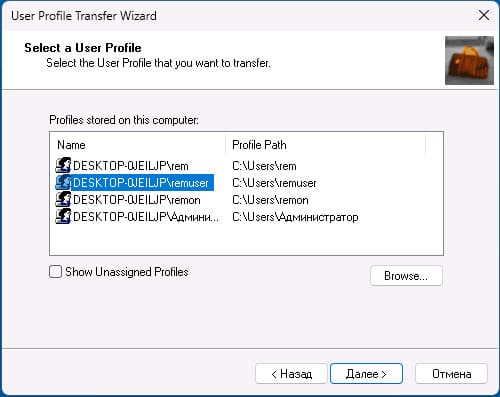 2. Выберите профиль пользователя, данные которого нужно перенести. Учтите, что по умолчанию в архив включаются все файлы из пользовательских папок: Рабочий стол, Документы, Изображения, Загрузки. Если какие-то папки переносить не нужно, очистите их или отредактируйте файл конфигурации (об этом в конце статьи).
