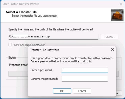 4. При необходимости установите пароль на архив с данными профиля пользователя. Если пароль не нужен — нажмите «Ок».