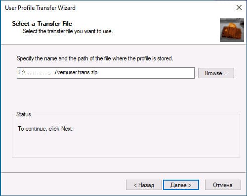 Импорт данных профиля пользователя Windows из ранее созданного файла выполняется следующим образом:
