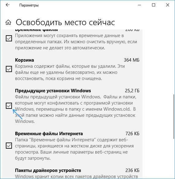 4. Найдите пункт Предыдущие установки Windows и отметьте его.